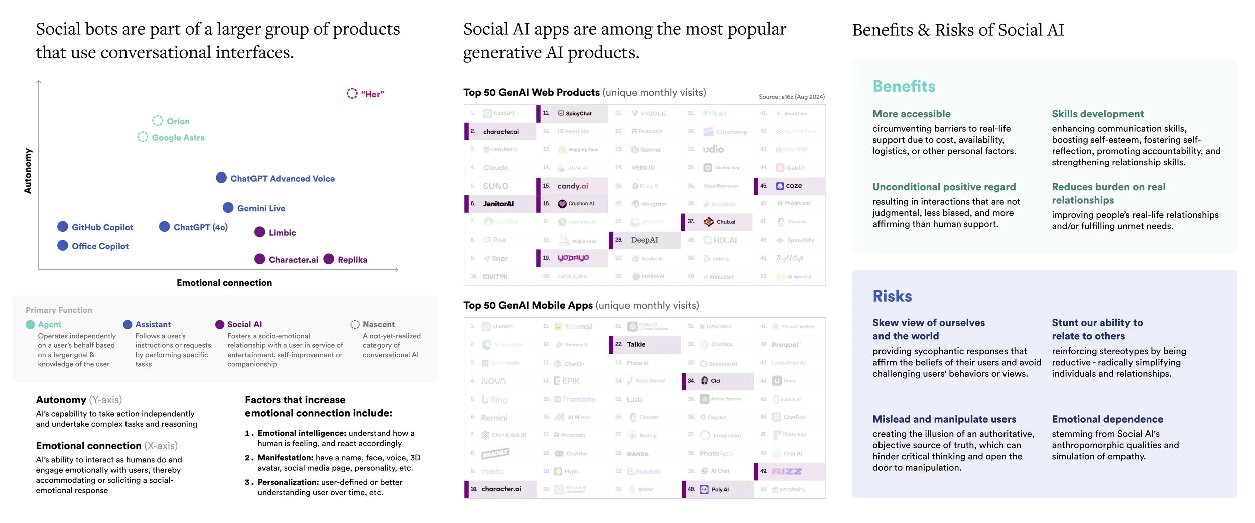 AI companions have emerged as a predominant use case for generative AI, and millions of people have built platonic and romantic relationships with chatbots. I led a team examining the emergence of popular platforms like Character.ai, Spicy Chat, and ChatGPT’s voice mode that delved into the the risks and benefits of socially engaging AI, the nature of AI-human relationships, and the potential societal impacts of AI designed to solicit emotional connection.